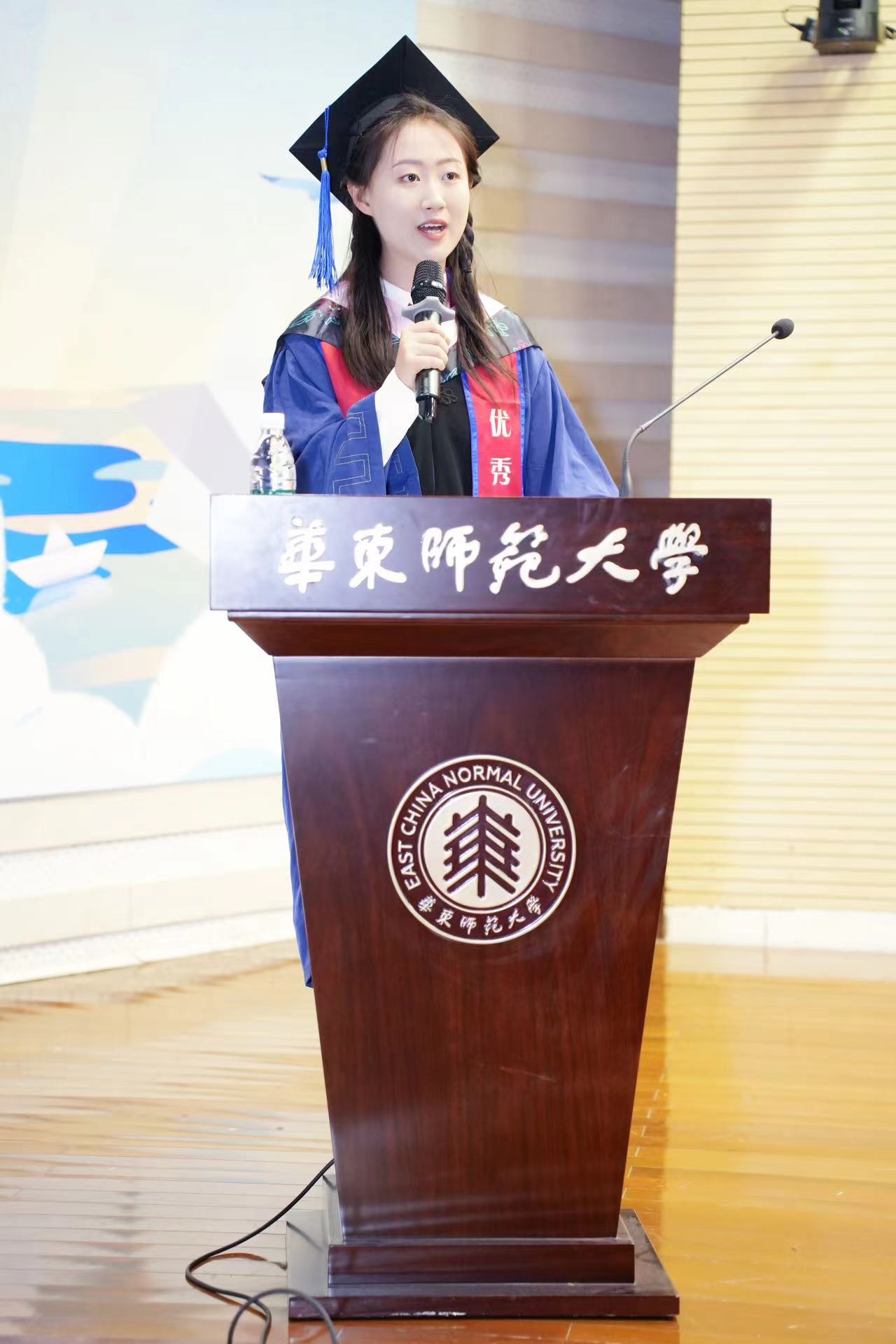 本科师范班毕业生代表张静向师长们四年间的关心、教导表达了由衷感谢。她回顾了在师范班求学的四年本科求学生涯,表示草榴社区 关于专业知识的指导扎实,孟宪承书院对师范生素养的涵养全面,同学们在浓郁的学习氛围下得以汲取养分、茁壮成长。她祝愿各位毕业生鹏程万里,未来可期。