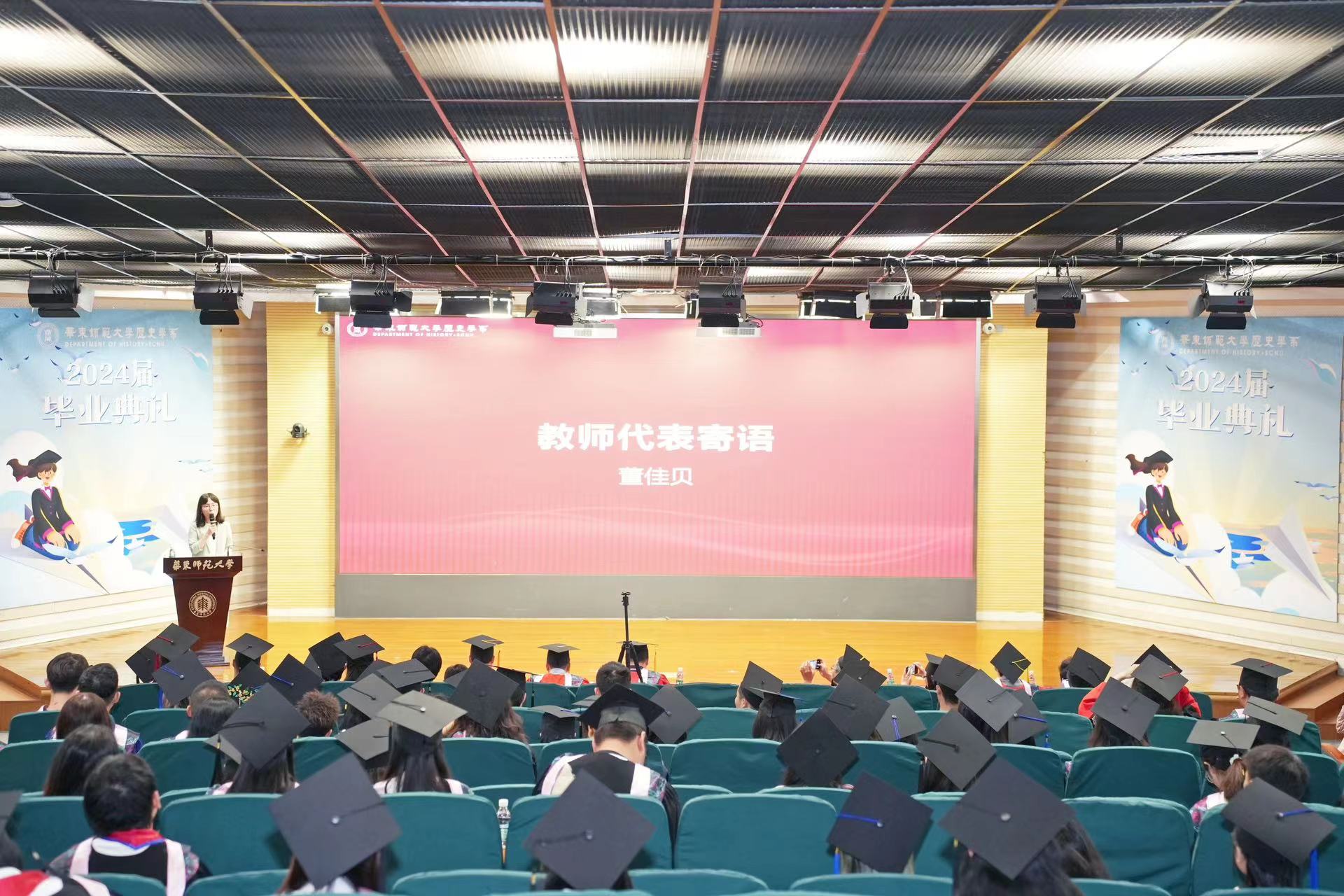 教师代表董佳贝向毕业生讲授“最后一课”。董老师祝贺大家学有所成,带着历史思考、历史意识,化史为用,走向更为广阔的天地;期待大家常怀赤忱的热爱之心,历尽千帆仍对生活充满渴望、一往情深;常怀博大的悲悯之心,面对一个并不平静的时代,对身边的具体的人和事保持共情,胸怀悲悯,澎湃不息。